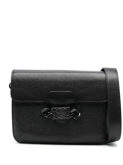 Черный, телячья кожа, зернистая текстура, цепочка, фурнитура цвета пушечной бронзы, откидной клапан, регулируемый ремень на плечо и основное отделение.