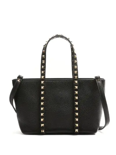 Подробнее о товаре: • черный • телячья кожа • зернистая текстура • застежка на молнии сверху • две плоские верхние ручки • съемный ремень на плечо • заклепки Rockstud • основное отделение • В комплект входит мешок-пыльник для хранения.