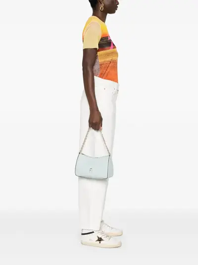 Подробнее о товаре: • голубой • телячья кожа • зернистая текстура • металлический логотип • логотип сзади • цепочный ремень • регулируемый плечевой ремень с жаккардовым логотипом • основное отделение • внутренняя вставка с логотипом • внутренний карман на молнии • внутренний накладной карман • цельная подкладка • золотистая фурнитура • застежка на молнии сверху