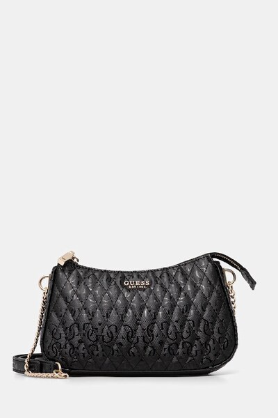 Небольшая сумочка из коллекции Guess. Модель с застёжкой-крючком, выполнена из синтетического материала. - Застежка-молния. - Несъемный, регулируемый ремешок. - Модель на подкладке. - Не подходит для формата А4. - Внутренний карман на молнии. - Количество слотов для карт: 3. - Глубина: 4,5 см. - Высота: 12,5 см. - Ширина у основания: 21,5 см.