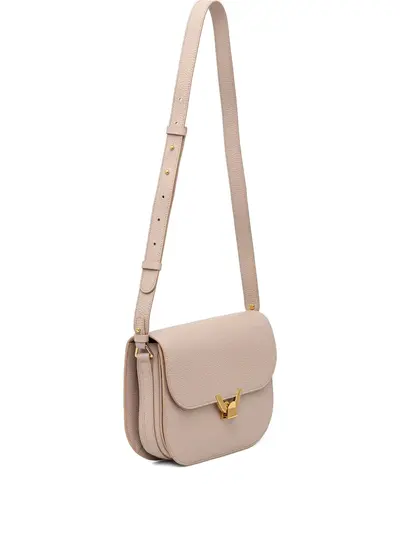 Подробнее о товаре: • светло-бежевый • золотистая пряжка • регулируемый ремень на плечо • закругленный клапан • основное отделение • внутренние карманы