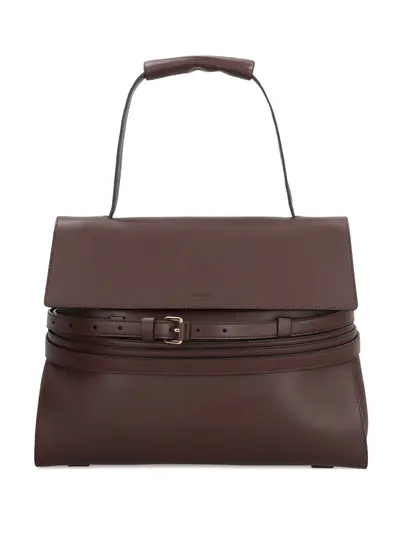 Темно-коричневая кожаная конструкция, верхняя ручка, пряжка, ремень, застежка на двойной клапан.