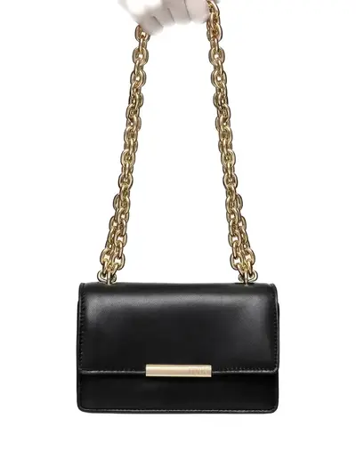 Черная кожаная конструкция, золотистый ремешок-цепочка, застежка на клапан, прямоугольная форма
