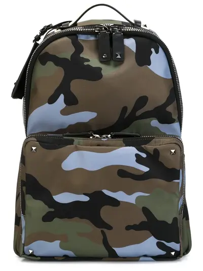 Зеленый с голубым рюкзак Rockstud от Valentino Garavani. Верхняя ручка, застёжка на молнии сверху, передний карман на молнии, регулируемые лямки , пирамидальные заклёпки из рутения, внутренний накладной карман, внутренняя заплатка с логотипом, брендовая заплатка сзади, камуфляжный принт.