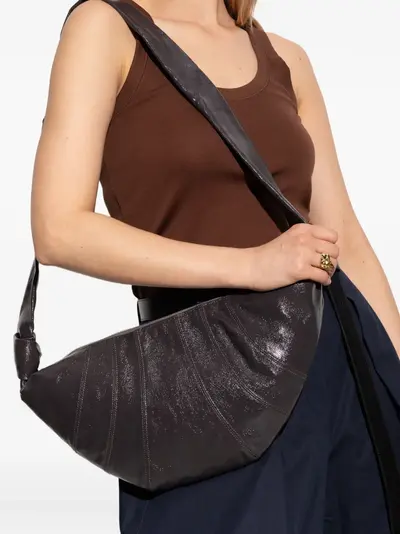 Подробнее о товаре: • темно-серый • изогнутая форма • ремешки с узелками • застежка на молнии • дизайн со вставками • фактурная кожа • На вещи могут быть складки и потертости — это не следы использования, а особенности техники обработки, которую используют Lemaire, чтобы подчеркнуть естественную текстуру кожи.
