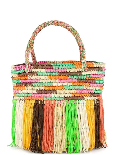 Подробнее о товаре: • разноцветный • длинная бахрома • две ручки • открытый верх • замысловатый узор