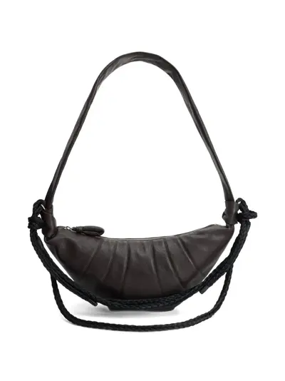 Подробнее о товаре: • темно-коричневый • кожа • плоский ремень на плечо с узлом • застежка на молнии • стеганая петля для подтягивания • На вещи могут быть складки и потертости - это не следы использования, а особенности техники обработки, которую используют Lemaire, чтобы подчеркнуть естественную текстуру кожи.