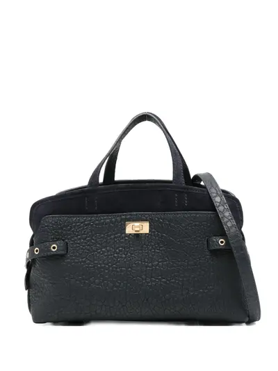 Темно-синий две верхние ручки фурнитура золотистого оттенка верхняя застежка-молния фактурная отделка плечевой ремень