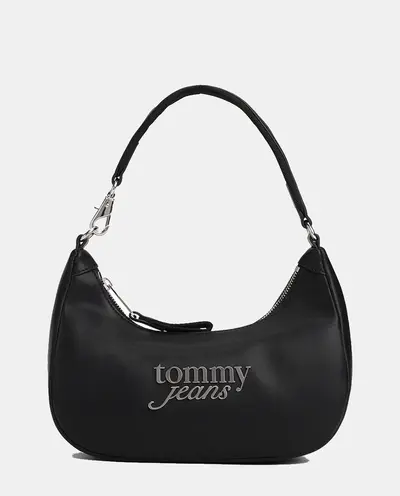 Сумка через плечо с изогнутой формой, выполненная из синтетического материала черного цвета. Выделяется большой вышитой надписью «Tommy Jeans» на передней части. Фиксированная ручка с металлической фурнитурой, идеально подходит для городского и молодежного стиля.