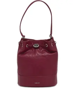 Подробнее о товаре: красная кожаная сумка с ручкой, затягивающейся шнурком, фурнитурой серебристого оттенка и логотипом
